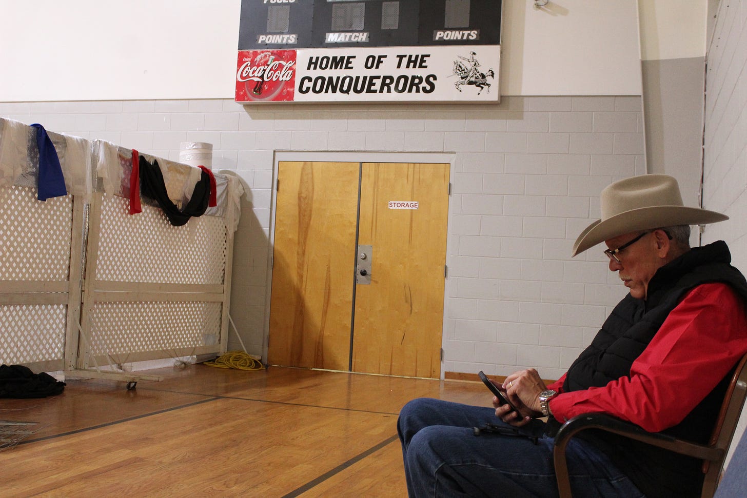 The vote tallies got closer as the night wore on; at one point, I caught a photo of Page sitting alone, clinging to his phone, under a gym scoreboard that read “Home of the Conquerors.” After that, he ducked into a storage room for a while to avoid the cameras.